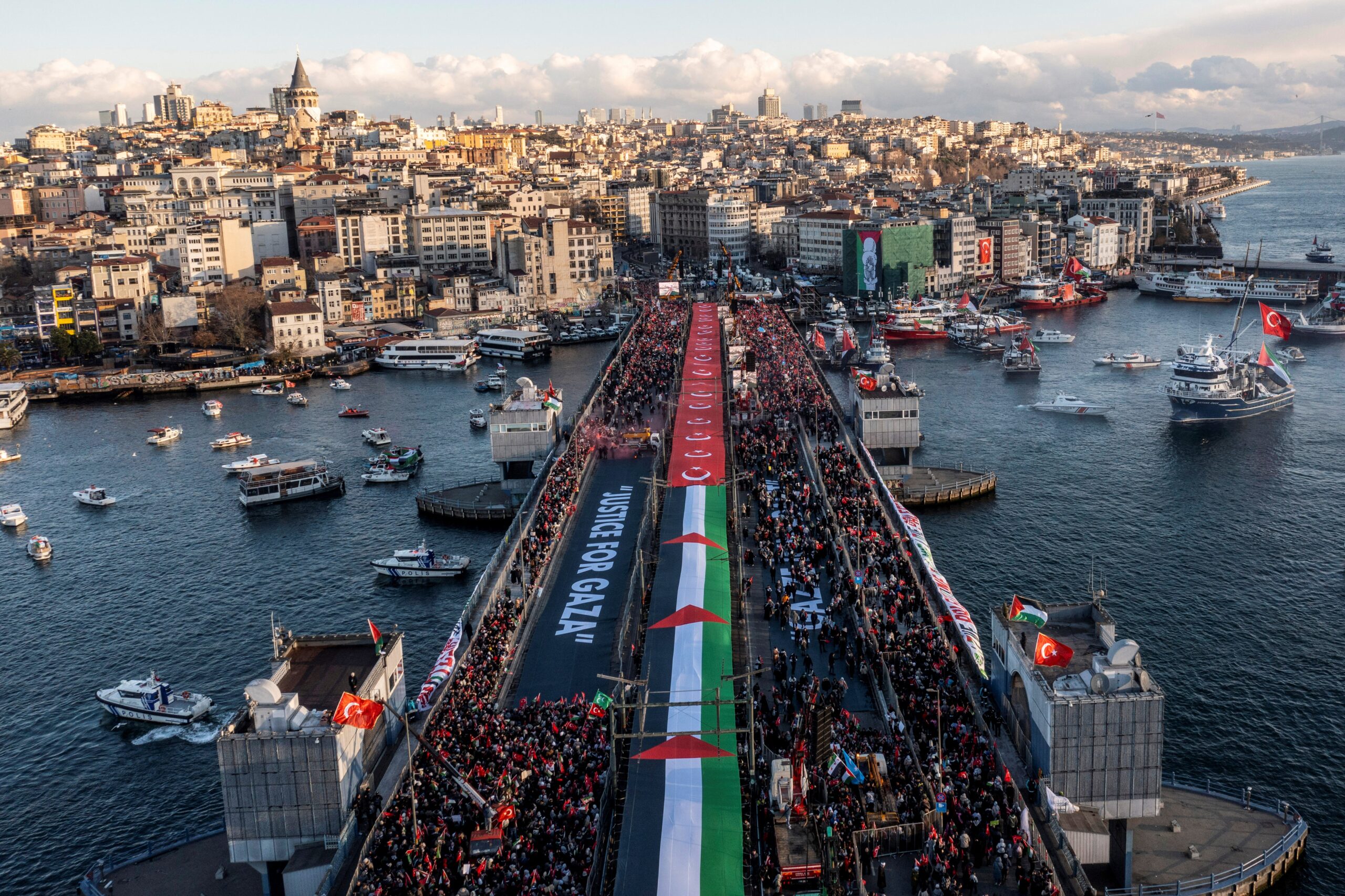 Δεκάδες χιλιάδες άνθρωποι συμμετείχαν χθες Πέμπτη στην Κωνσταντινούπολη σε πορεία και συγκέντρωση σε ένδειξη υποστήριξης στους Παλαιστινίους στη Λωρίδα της Γάζας, ανεμίζοντας παλαιστινιακές και τουρκικές σημαίες και καλώντας να τερματιστεί η βία στον παλαιστινιακό θύλακο που έχει υποστεί πελώρια καταστροφή από τον πόλεμο.