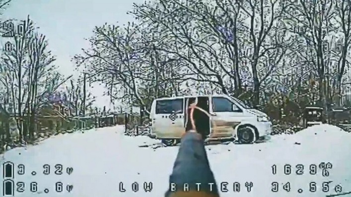 Στο υλικό που δόθηκε στη δημοσιότητα, δύο επιθετικά drones εμφανίζονται να επιχειρούν εναντίον μίνι βαν.