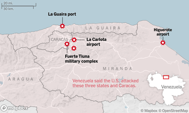 Σε ένα λιμάνι, δύο αεροδρόμια και ένα σύμπλεγμα στρατιωτικών υποδομών, εξαπέλυσαν χτυπήματα οι δυνάμεις των ΗΠΑ, στο πλαίσιο της επιχείρησης σύλληψης του Νικολάς Μαδούρο και της συζύγου του. Οι New York Times δημοσίευσαν σχετικό χάρτη.