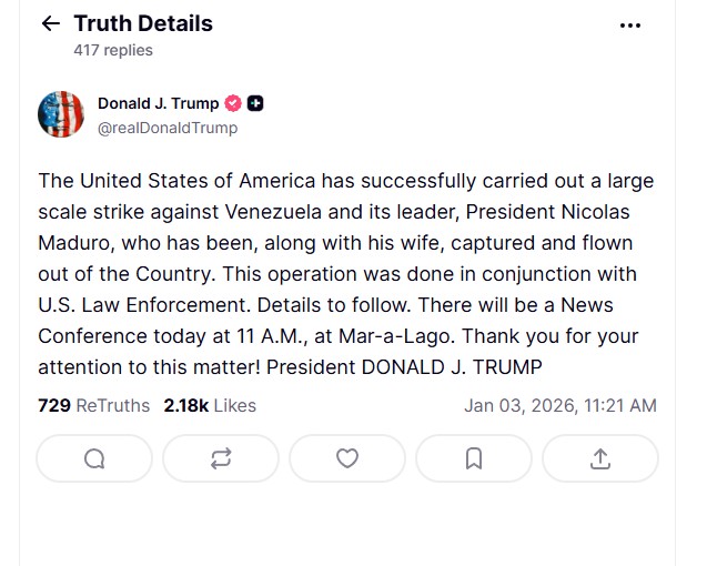 Οι Ηνωμένες Πολιτείες της Αμερικής έχουν πραγματοποιήσει με επιτυχία μια επιχείρηση μεγάλης κλίμακας εναντίον της Βενεζουέλας και του ηγέτη της, Νικολάς Μαδούρο, ο οποίος, μαζί με τη σύζυγό του, έχει συλληφθεί και μεταφερθεί εκτός της χώρας. [...] Λεπτομέρειες θα ακολουθήσουν. Θα πραγματοποιηθεί Συνέντευξη Τύπου σήμερα στις 11 π.μ., στο Mar-a-Lago. Σας ευχαριστώ για την προσοχή σας σε αυτό το ζήτημα!