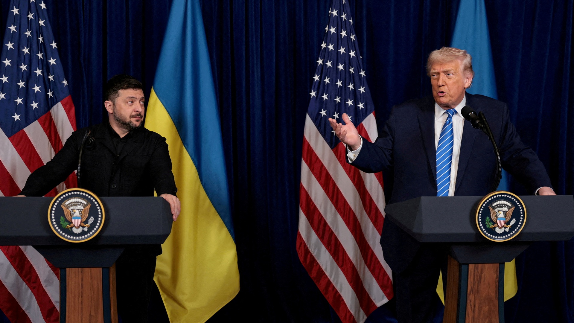 Ερωτηθείς γιατί οι διαπραγματεύσεις υπό την ηγεσία των ΗΠΑ δεν έχουν ακόμη επιλύσει τη μεγαλύτερη χερσαία σύγκρουση της Ευρώπης από τον Β΄ Παγκόσμιο Πόλεμο, ο Τραμπ απάντησε: «Ζελένσκι».