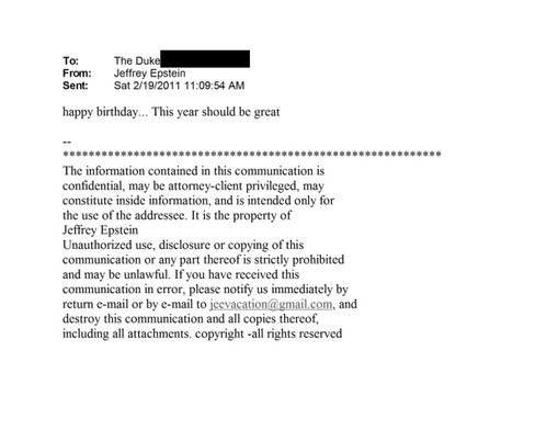 Ο Τζέφρι Επσταϊν έστειλε μήνυμα γενεθλίων στον Αντριου Μάουντμπάτεν-Ουίνδσορ στις 19 Φεβρουαρίου 2011, σύμφωνα με έγγραφα που δόθηκαν στη δημοσιότητα. Στο σύντομο email, ο Επσταϊν ευχόταν «χρόνια πολλά» και πρόσθετε ότι «αυτή η χρονιά θα πρέπει να είναι σπουδαία».