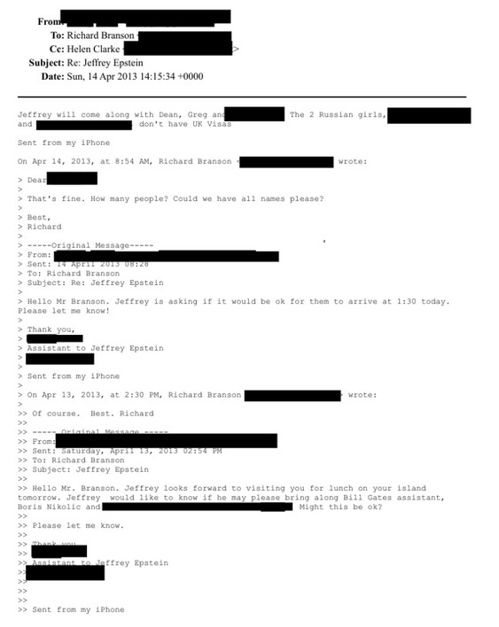Στα έγγραφα περιλαμβάνεται ανταλλαγή email από τον Απρίλιο του 2013, στην οποία βοηθός του Επσταϊν επιχειρεί να κανονίσει γεύμα στο ιδιωτικό νησί του Ρίτσαρντ Μπράνσον.