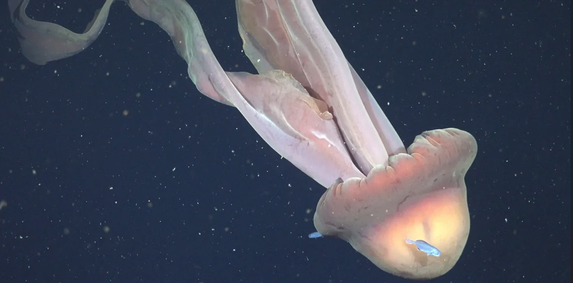 Επιστήμονες από το Schmidt Ocean Institute κατέγραψαν το απόκοσμο ωκεάνιο πλάσμα, το οποίο μπορεί να φτάσει σε διάμετρο το 1 μέτρο, με τα πλοκάμια του να φτάνουν σε μήκος τα 10 μέτρα.