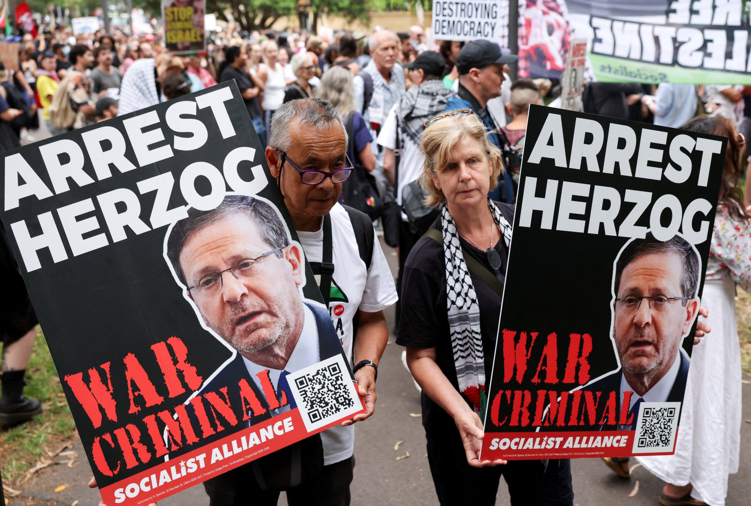 Τη συγκέντρωση είχε οργανώσει η Palestine Action Group, η οποία κατηγορεί τον Χέρτζογκ για «γενοκτονία» στη Λωρίδα της Γάζας και ζητεί από την Καμπέρα να ξεκινήσει έρευνα σε βάρος του, με βάση τις διεθνείς της υποχρεώσεις.