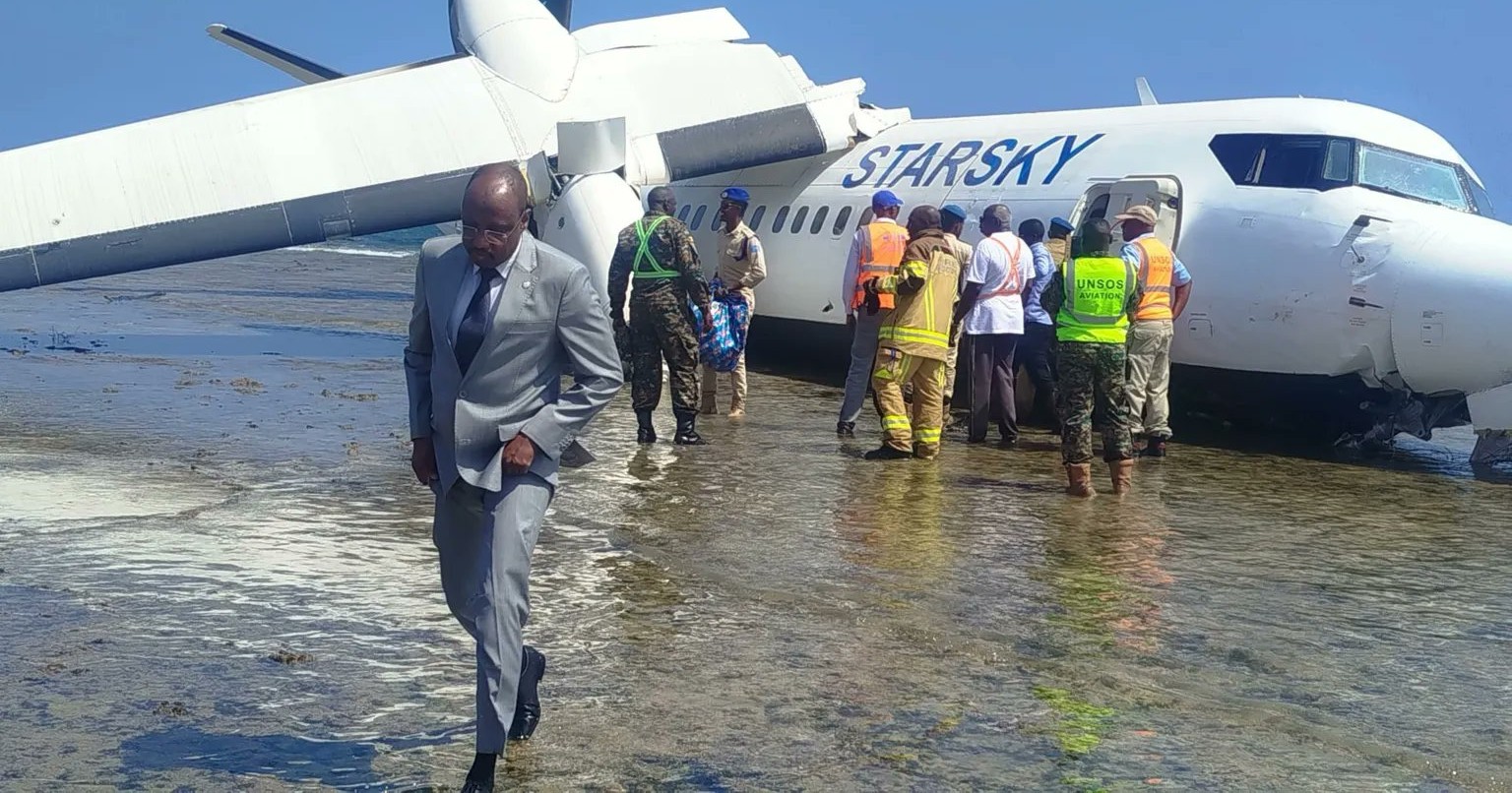 A passenger aircraft carrying up to 50 people veered off the runway and onto the shoreline at Mogadishu’s Aden Abdulle International Airport during an emergency landing. The plane, operated by Starsky Aviation, developed a technical problem shortly after takeoff.
