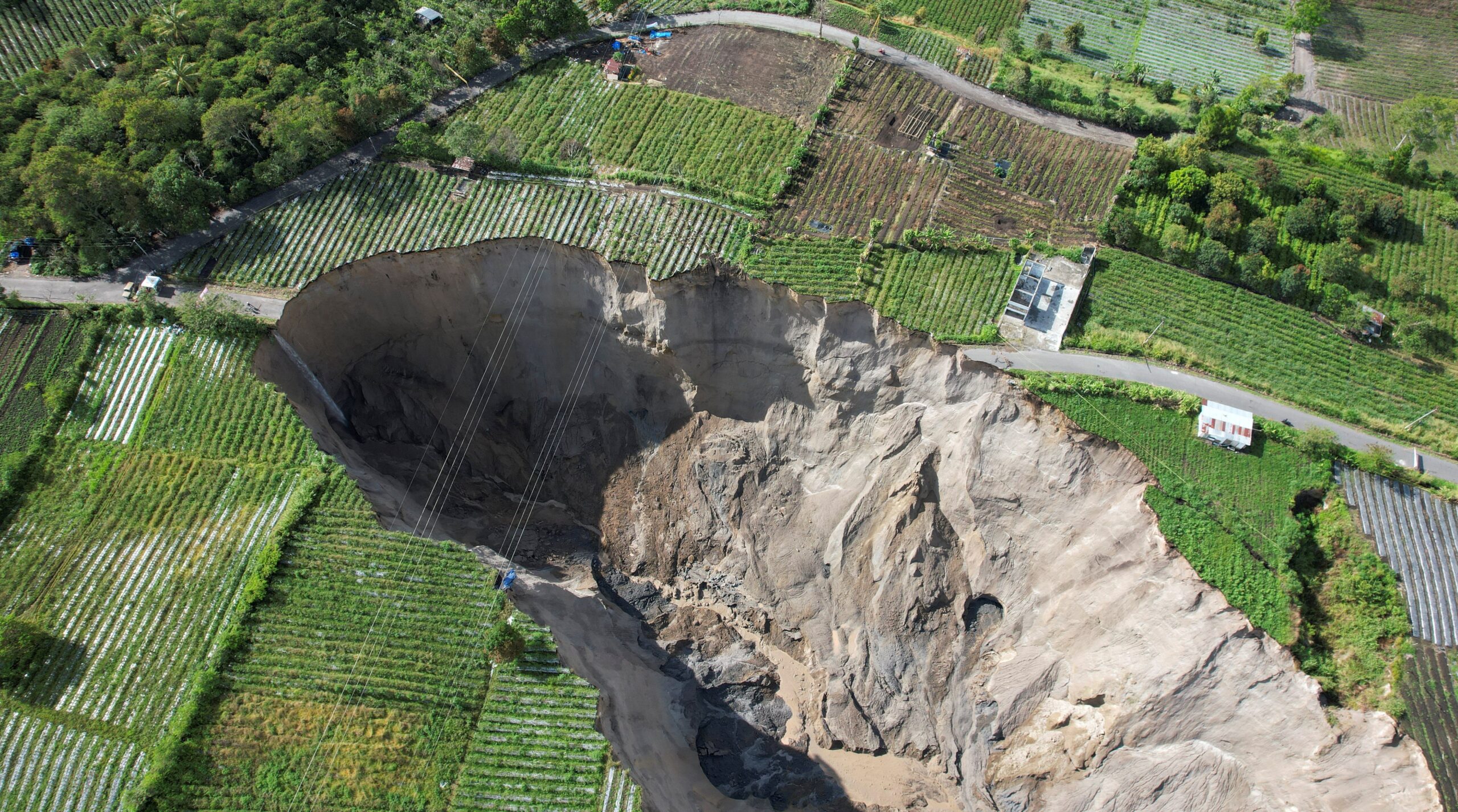 Drone video captured a growing sinkhole cutting across farmland in Indonesia. Local farmers say the ground keeps moving, even without rain. pic.twitter.com/Zoa1EbPnUn