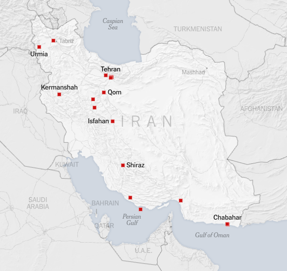 Ακολουθεί χάρτης με τις περιοχές του Ιράν που έχουν δεχθεί πλήγματα από την έναρξη της αμερικανο-ισραηλινής στρατιωτικής επίθεσης.