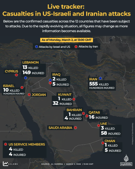 - Σε αντίποινα για την επίθεση του Σαββάτου, στην οποία σκοτώθηκαν κορυφαίοι ηγέτες του κρατικού μηχανισμού, συμπεριλαμβανομένου του ανώτατου ηγέτη της Χαμενεΐ, η Τεχεράνη εξαπέλυσε πλήγματα προς γειτονικές χώρες, βάζοντας στο στόχαστρο πάνω απ’ όλα αμερικανικές βάσεις, και στο Ισραήλ, όπου χθες σκοτώθηκαν εννιά άνθρωποι, σύμφωνα με τις υπηρεσίες άμεσης βοήθειας.