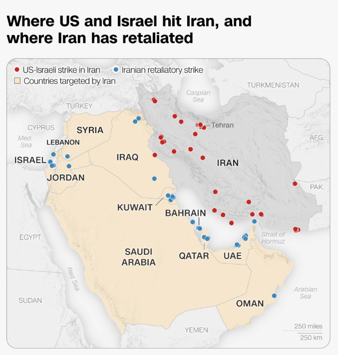 Απειλείται εξάπλωση του πολέμου σε όλη την περιοχή μετά τους βομβαρδισμούς που άρχισαν να εξαπολύουν το Σάββατο οι ΗΠΑ και το Ισραήλ στο Ιράν και τα αντίποινα της Τεχεράνης, θέτοντας σε κίνδυνο τη ναυσιπλοΐα στα Στενά του Ορμούζ, από όπου διέρχεται το 20% του πετρελαίου που καταναλώνεται σε παγκόσμια κλίμακα. Η ναυσιπλοΐα στην Ερυθρά Θάλασσα, που οδηγεί στη Διώρυγα του Σουέζ, ίσως απειληθεί επίσης.