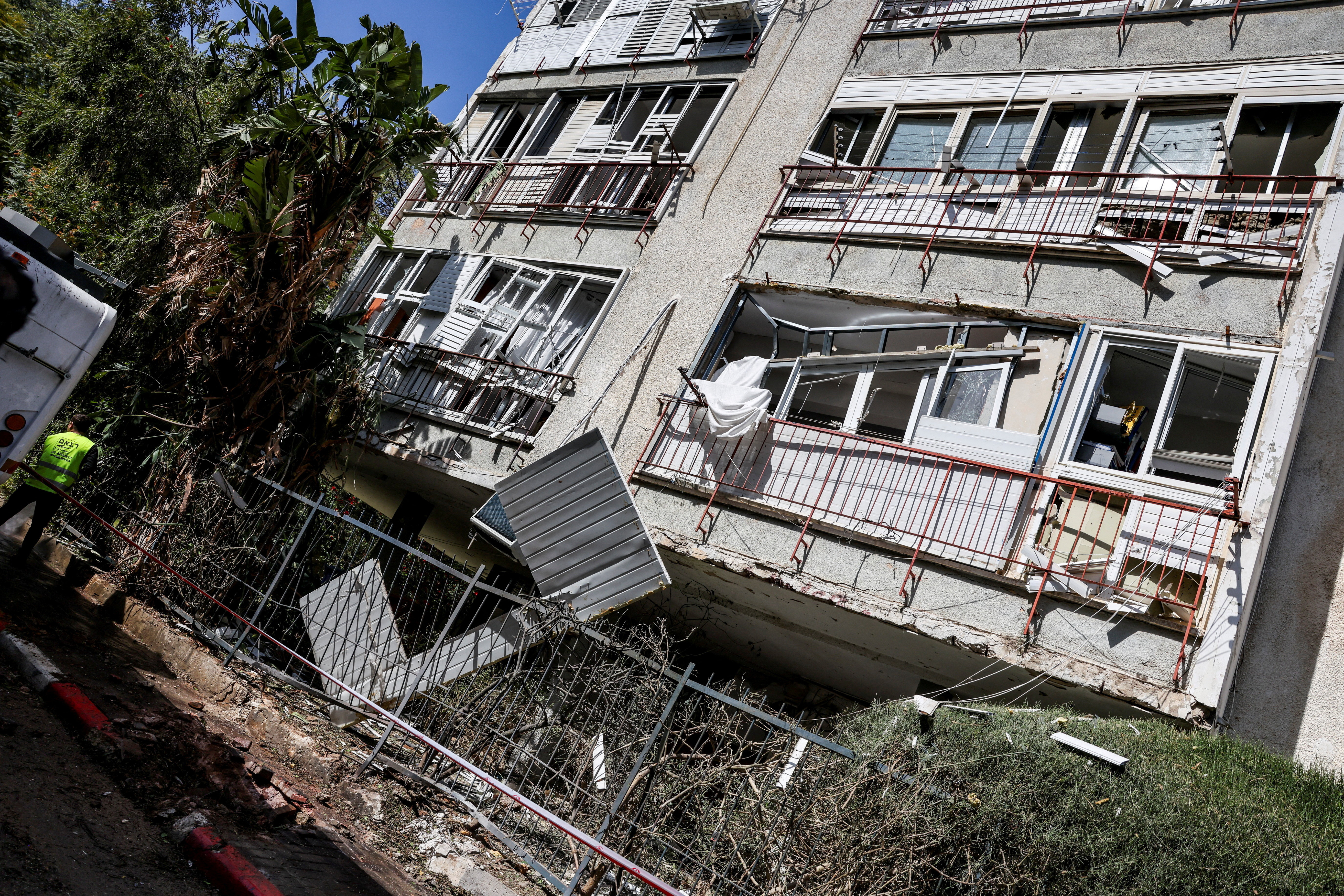Η υπηρεσία άμεσης βοήθειας του Ισραήλ έδωσε στη δημοσιότητα οπτικό υλικό που εικονίζει πολυκατοικία στο κεντρικό Ισραήλ, όπου χτυπήθηκε αυλή, χωρίς πάντως να απειληθεί το ίδιο το κτίριο.