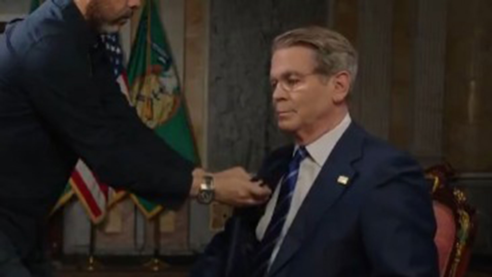 «Κύριε υπουργέ, πρέπει να πω ότι αυτό είναι πρωτοφανές… να απομακρύνεται ένας καλεσμένος από συνέντευξη για να μεταβεί στην αίθουσα διαχείρισης κρίσεων», είπε ο Γουίλφρεντ Φροστ όταν επέστρεψε ο υπουργός, ρωτώντας τον: «Πώς είναι ο πρόεδρος; Ηταν αγχωμένος;»