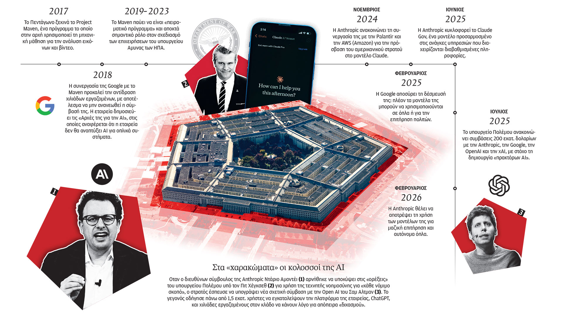 Ο Αμοντέι δεν υπέκυψε στις απειλές και η Anthropic βρέθηκε να αποτελεί «εθνικό κίνδυνο». Είναι μια «woke αριστερή εταιρεία ΑΙ», έσπευσε να πει ο πρόεδρος Ντόναλντ Τραμπ. Λίγες ώρες μετά την κορύφωση της αντιπαράθεσης, η OpenAI, η μεγαλύτερη ανταγωνίστρια της Anthropic, ανακοίνωσε διά στόματος του διευθύνοντος συμβούλου της Σαμ Αλτμαν ότι συνήψε μια νέα συμφωνία με το υπουργείο Πολέμου. Το δικό της μοντέλο θα παρέχεται στον στρατό για «κάθε νόμιμο σκοπό», με τη διαφορά ότι τα δύο μέρη δεσμεύτηκαν για μερικές ακόμα δικλίδες ασφαλείας.