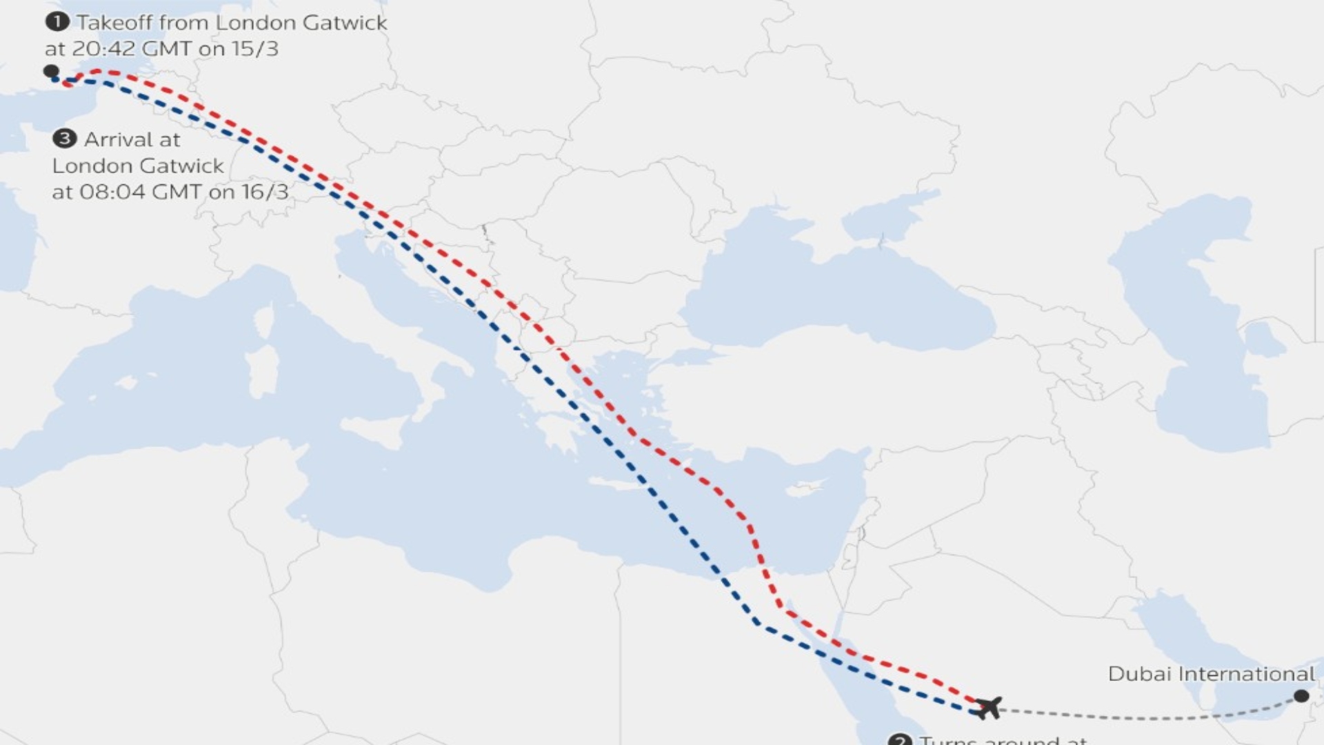 Καθώς η πτήση EK10 της Emirates από το Λονδίνο βρισκόταν πάνω από τη Σαουδική Αραβία τη Δευτέρα, έγινε γνωστό ότι σημειώθηκε επίθεση με drone στον προορισμό της, το Ντουμπάι. Το αεροσκάφος επέστρεψε στο αεροδρόμιο Γκάτγουικ ολοκληρώνοντας ένα ταξίδι 9.100 χιλιομέτρων. Πρόκειται για ακόμα μία από τις δεκάδες «πτήσεις προς το πουθενά» που προκάλεσε ο πόλεμος στη Μέση Ανατολή.