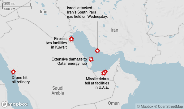 - Ρας Λαφάν, βόρειο Κατάρ Η μεγαλύτερη εγκατάσταση παραγωγής υγροποιημένου φυσικού αερίου (ΥΦΑ) στον κόσμο, στο Ρας Λαφάν του Κατάρ, υπέστη «σημαντικές» ζημιές από ιρανικές επιθέσεις, σύμφωνα με την QatarEnergy, τη δημόσια ενεργειακή εταιρεία του Κατάρ, αυξάνοντας τις ανησυχίες για την παγκόσμια ενεργειακή τροφοδοσία. Το Ρας Λαφάν έχει γίνει στόχος επανειλημμένα από την έναρξη του πολέμου και από την Τετάρτη δέχεται διαδοχικές επιθέσεις που προκάλεσαν «σημαντικές πυρκαγιές», οι οποίες έχουν πλέον ελεγχθεί.