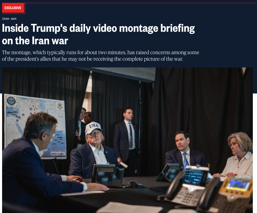 Ωστόσο, η ενημέρωση μέσω αυτών των βίντεο τροφοδοτεί τις ανησυχίες ορισμένων συμμάχων του Τραμπ ότι ενδέχεται να μην λαμβάνει -ή να μην αφομοιώνει- την πλήρη εικόνα του πολέμου, ο οποίος βρίσκεται πλέον στην τέταρτη εβδομάδα του, ανέφεραν δύο αξιωματούχοι.