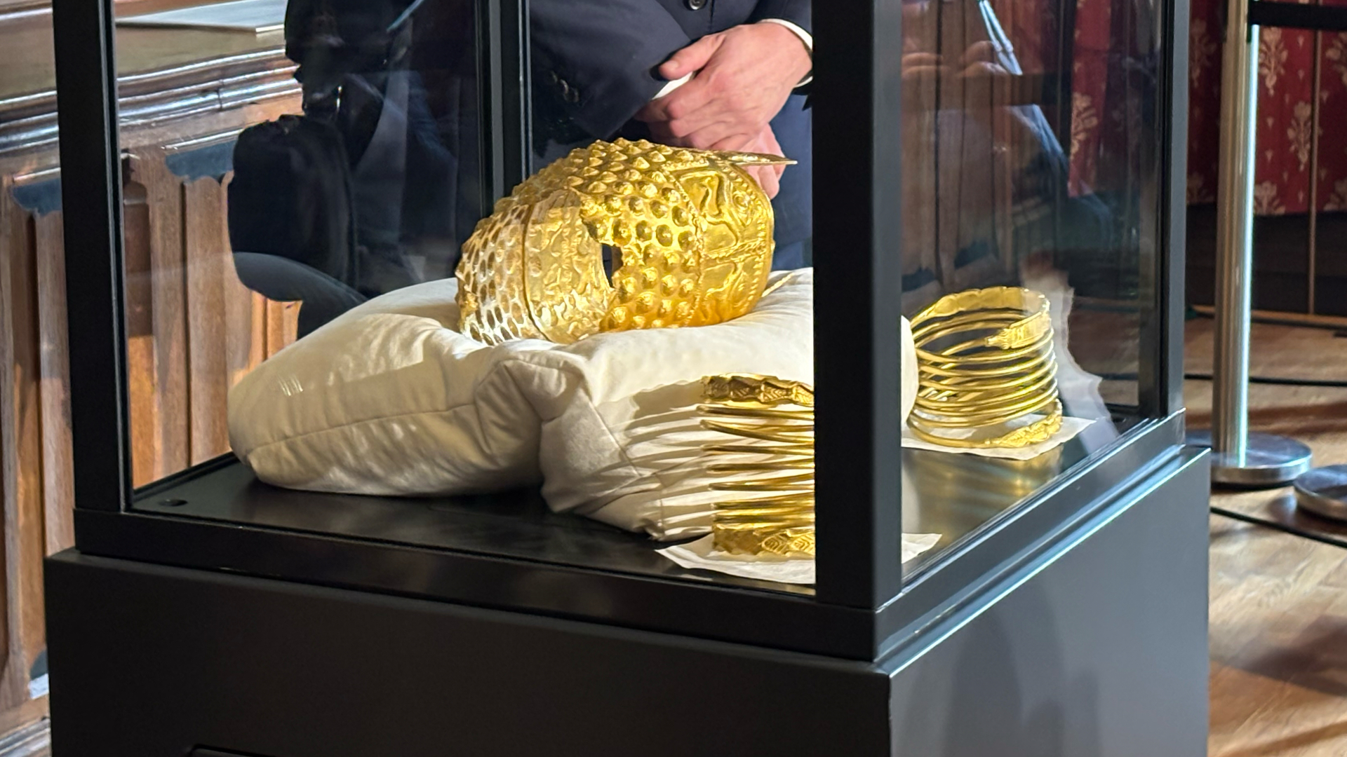 Εκπρόσωπος της εισαγγελίας παρουσίασε το χρυσό κράνος του Κοτσοφενέστι, που ανάγεται στον 5ο π.Χ. αιώνα, καθώς και δύο από τα τρία βραχιόλια που κλάπηκαν τον Ιανουάριο του 2025.