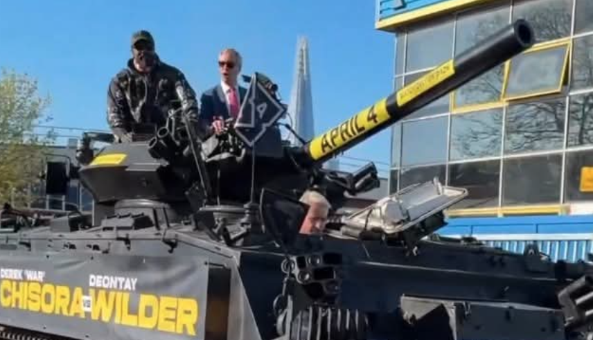 Ο πυγμάχος βαρέων βαρών Ντέρεκ Τσισόρα έφτασε χθες, Πέμπτη, σε συνέντευξη Τύπου πάνω σε στρατιωτικό άρμα μάχης, μαζί με τον… Νάιτζελ Φάρατζ.