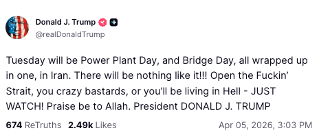 Δεν υπήρξε πασχαλινή ανάπαυλα για τον Ντόναλντ Τραμπ και τη ρητορική του αναφορικά με το Ιράν: ο Αμερικανός πρόεδρος ανήρτησε σήμερα ένα ιδιαίτερα αιχμηρό κείμενο με ύβρεις, απευθυνόμενος στο Ιράν, το οποίο προκάλεσε αντιδράσεις μεταξύ των Δημοκρατικών αλλά και σε συντηρητικό ακροατήριο.