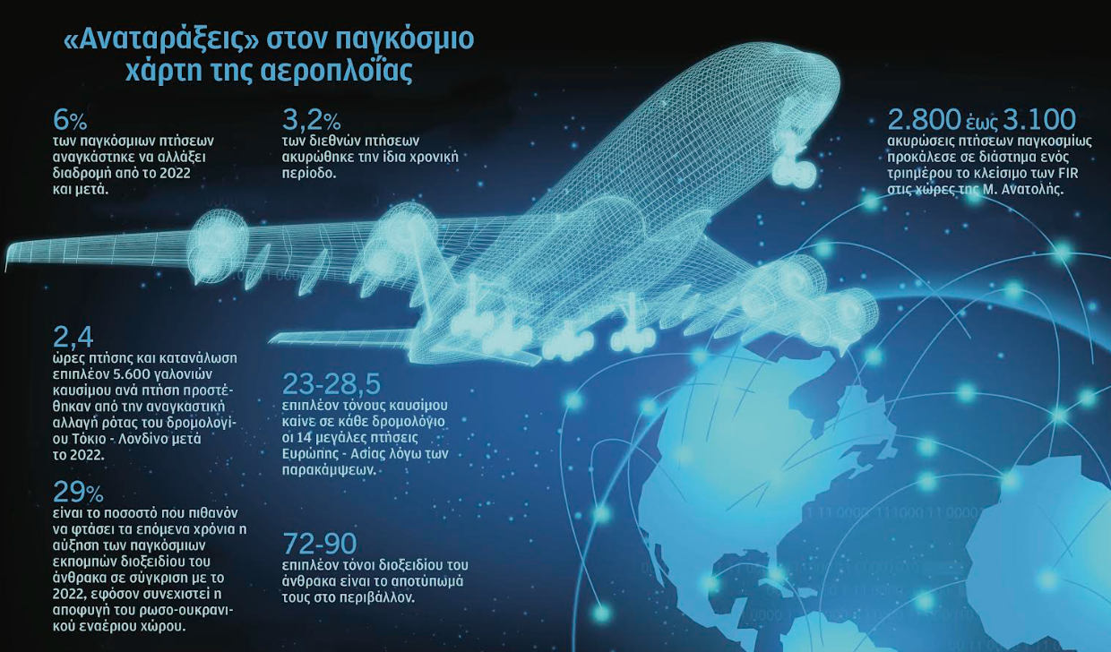 «Είναι ενδεικτικό το παράδειγμα πτήσης από το Τόκιο προς το Λονδίνο που ενώ πριν από το 2022 πετούσε δυτικά, πάνω από ρωσικό έδαφος, από το ’22 κι έπειτα πετά ανατολικά, μέσω Ειρηνικού, Αλάσκας και Καναδά, προσθέτοντας συνολικά 2,4 ώρες πτήσης και κατανάλωση επιπλέον 5.600 γαλονιών καυσίμου ανά πτήση. Στα 14 μεγάλα δρομολόγια Ευρώπης – Ασίας οι πτήσεις με παρακάμψεις καίνε επιπλέον 23-28,5 τόνους καυσίμου ανά δρομολόγιο, εκπέμποντας 72-90 επιπλέον τόνους διοξειδίου του άνθρακα», σημειώνουν οι εκπρόσωποι της ΥΠΑ στην «Κ».