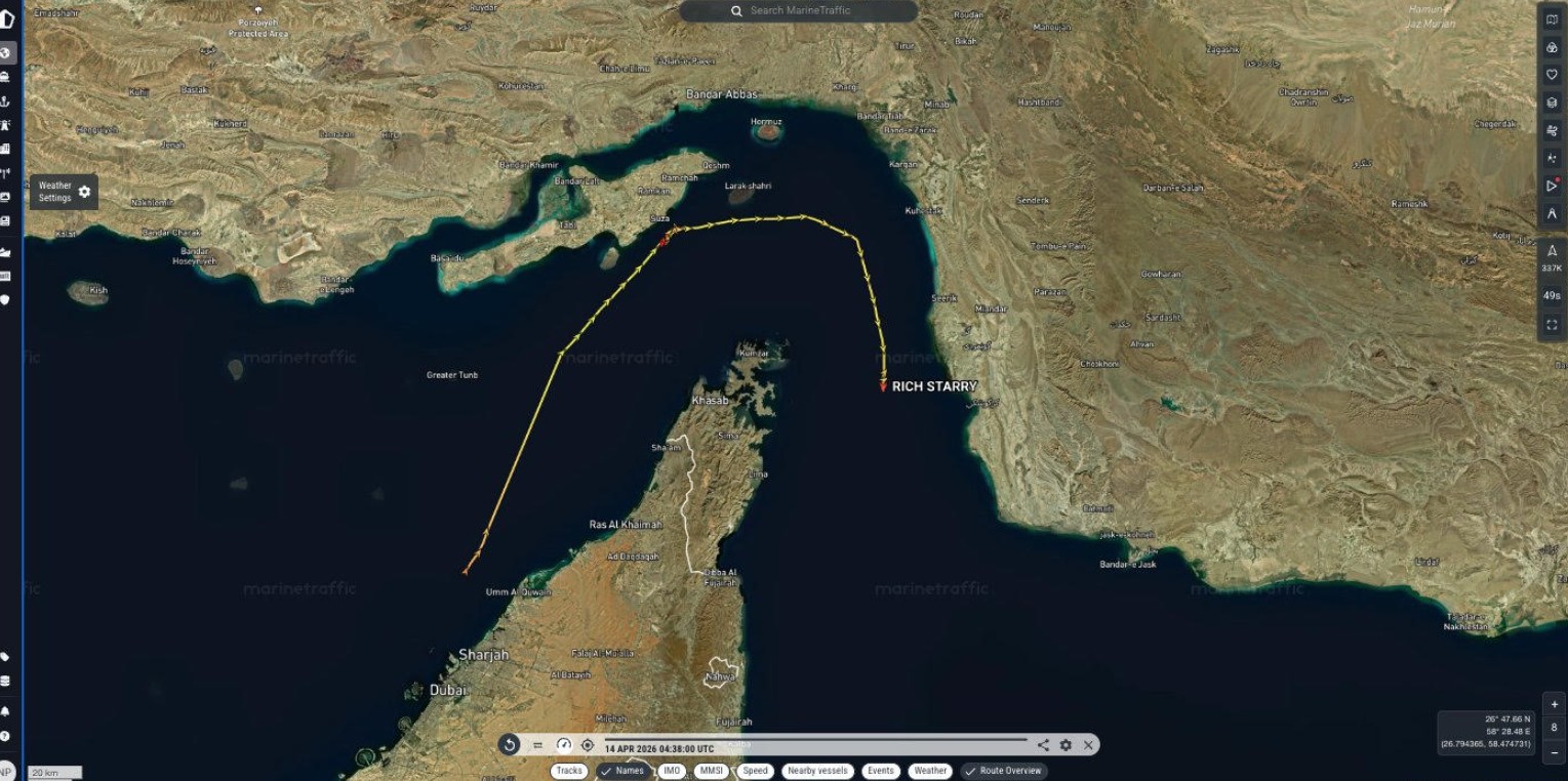 Το Rich Starry θα είναι το πρώτο που θα περάσει τα στενά και θα βγει από τον Περσικό Κόλπο από την έναρξη του αποκλεισμού, σύμφωνα με στοιχεία από τις εταιρείες ναυτιλιακής παρατήρησης LSEG, MarineTraffic και Kpler.