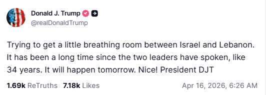 «Προσπαθώ να δημιουργήσω λίγο χώρο για να ανασάνουν το Ισραήλ και ο Λίβανος. Εχει περάσει πολύς καιρός που οι δυο ηγέτες δεν έχουν μιλήσει, κάπου 34 χρόνια. Αυτό θα γίνει αύριο. Ωραία!», ανέφερε ο πρόεδρος των ΗΠΑ μέσω Truth Social.