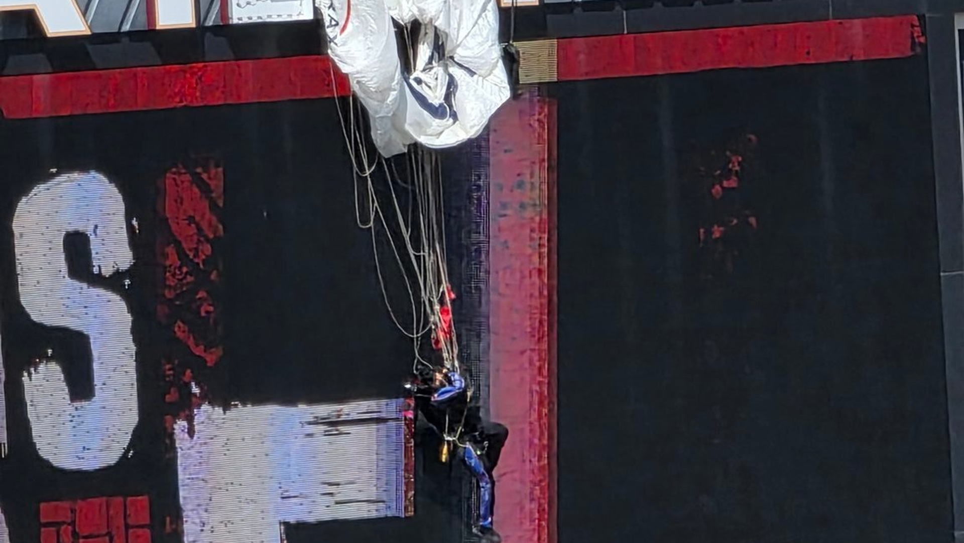 Τα βίντεο, που έγιναν viral από το εσωτερικό του σταδίου Lane του Virginia Tech, έδειχναν δύο αλεξιπτωτιστές να κατεβαίνουν στην αρένα πριν από τον εαρινό αγώνα του σχολείου, όταν ένας από αυτούς έχασε την καθορισμένη περιοχή προσγείωσης, χτύπησε στον ηλεκτρονικό πίνακα και μπλέχτηκε.