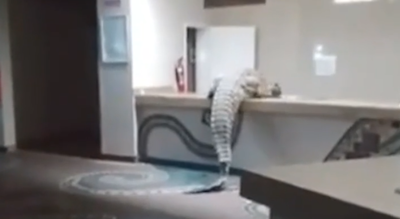 Μπροστά στα κατάπληκτα μάτια επισκεπτών και προσωπικού, ο κορυφαίος θηρευτής μήκους 3,6 μέτρων, καταγράφεται σε βίντεο να μπαίνει στο A’Zambezi River Lodge και να σκαρφαλώνει πάνω σε έναν πάγκο αναζητώντας τροφή.